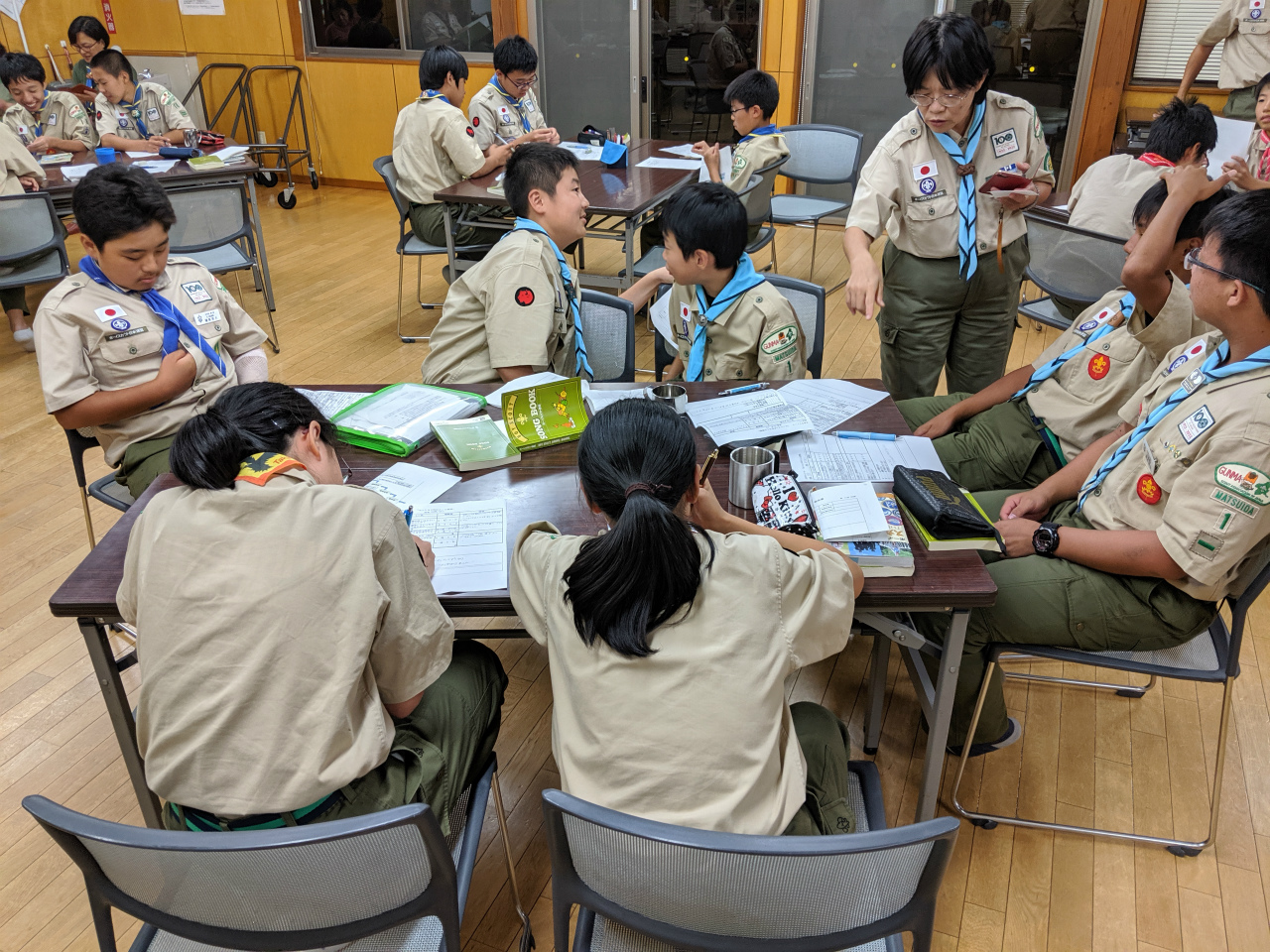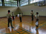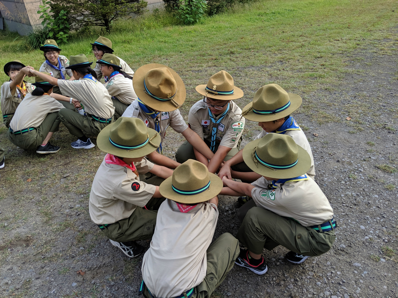 2019.10.05-06 高崎地区PLT 地区行事 2019.10.082025.10.10 地区行事 ボーイ隊(小6〜中学生) ボーイ隊は10月5日~6日の1泊2日で、高崎地区パトロール・リーダー・トレーニング(PLT)に参加しました。 PLTは班長・次長および将来の候補者が知識と心構えを習得する訓練です。 初日は市内の信越化学工業(株)体育館での座学、安中市学習の森での宿泊と交流会を行いました。 2日目は体育館に戻ってほかの参加者以外の班員と合流し、手旗信号を使ったゲームに挑戦しました。 朝礼後のミニゲーム「人間知恵の輪」の様子です。 (文・カブ隊長)