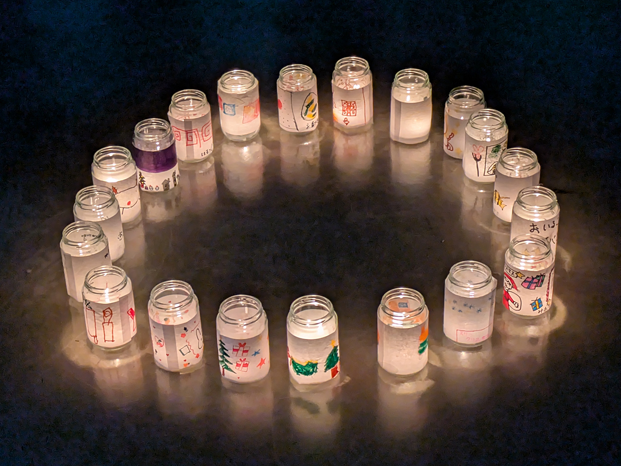 ビンの中にロウソクを入れて、半紙を貼り付けて絵や文字を書いたものです。