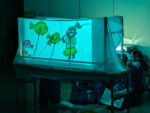 写真ではわかりづらいかもしれませんが、プロジェクターの光に青いフィルムをかぶせて海の中にいるような演出をしています。