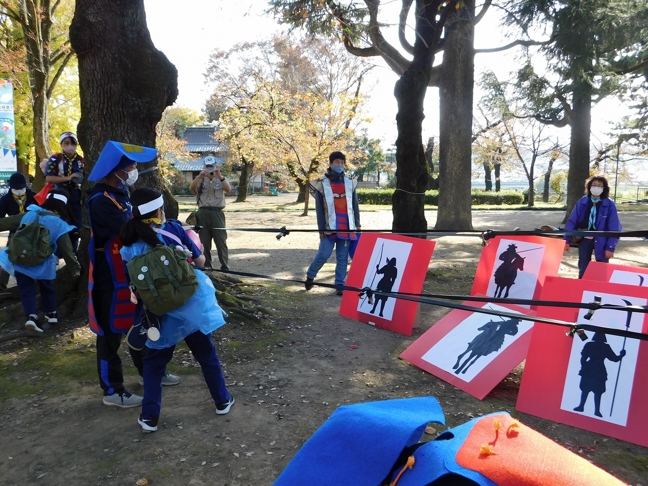 その他、三の陣「兵糧攻め」では「くす玉」を衣装に用意した刀で割ってお菓子を調達、四の陣「岩石落とし」では発泡スチロール製の玉を丘の上から落として「敵」をやっつけ、五の陣「石垣名人」ではダンボール箱を時間内にどうやってうまく重ねられるかを競いました。