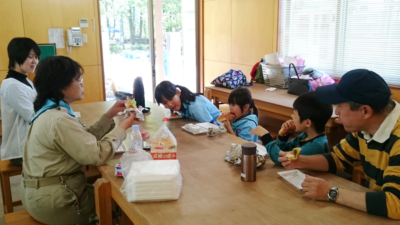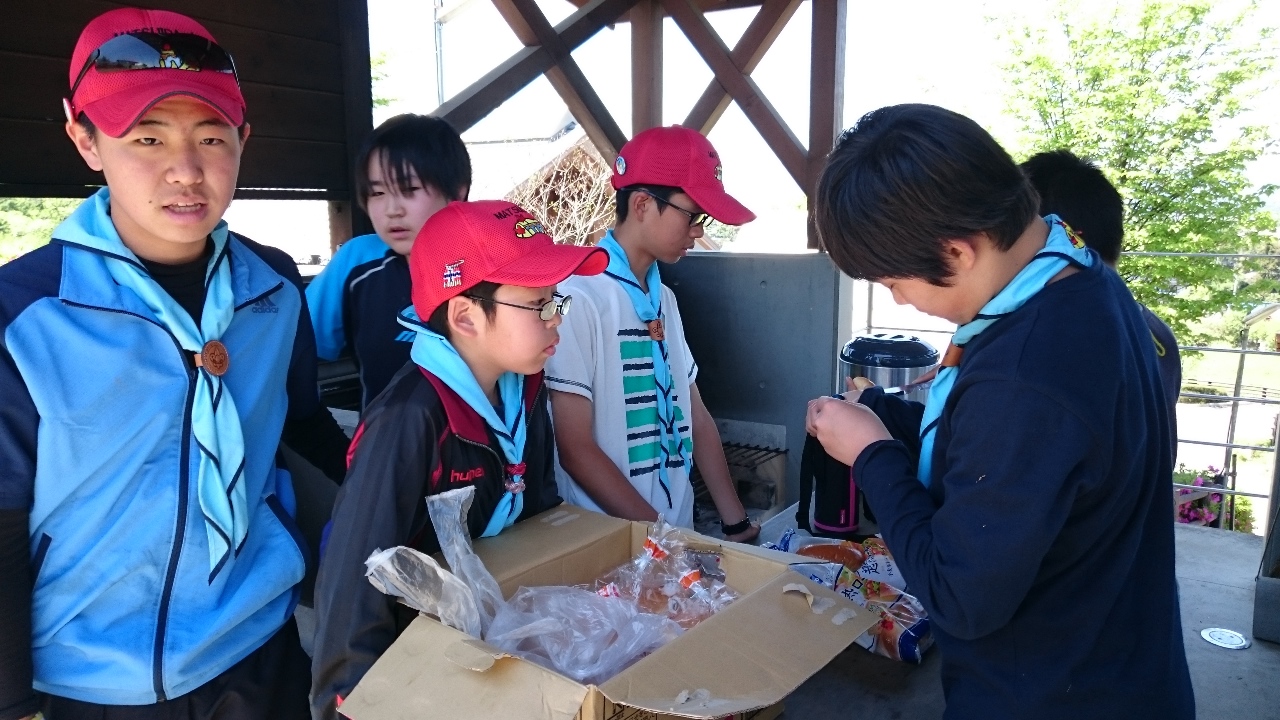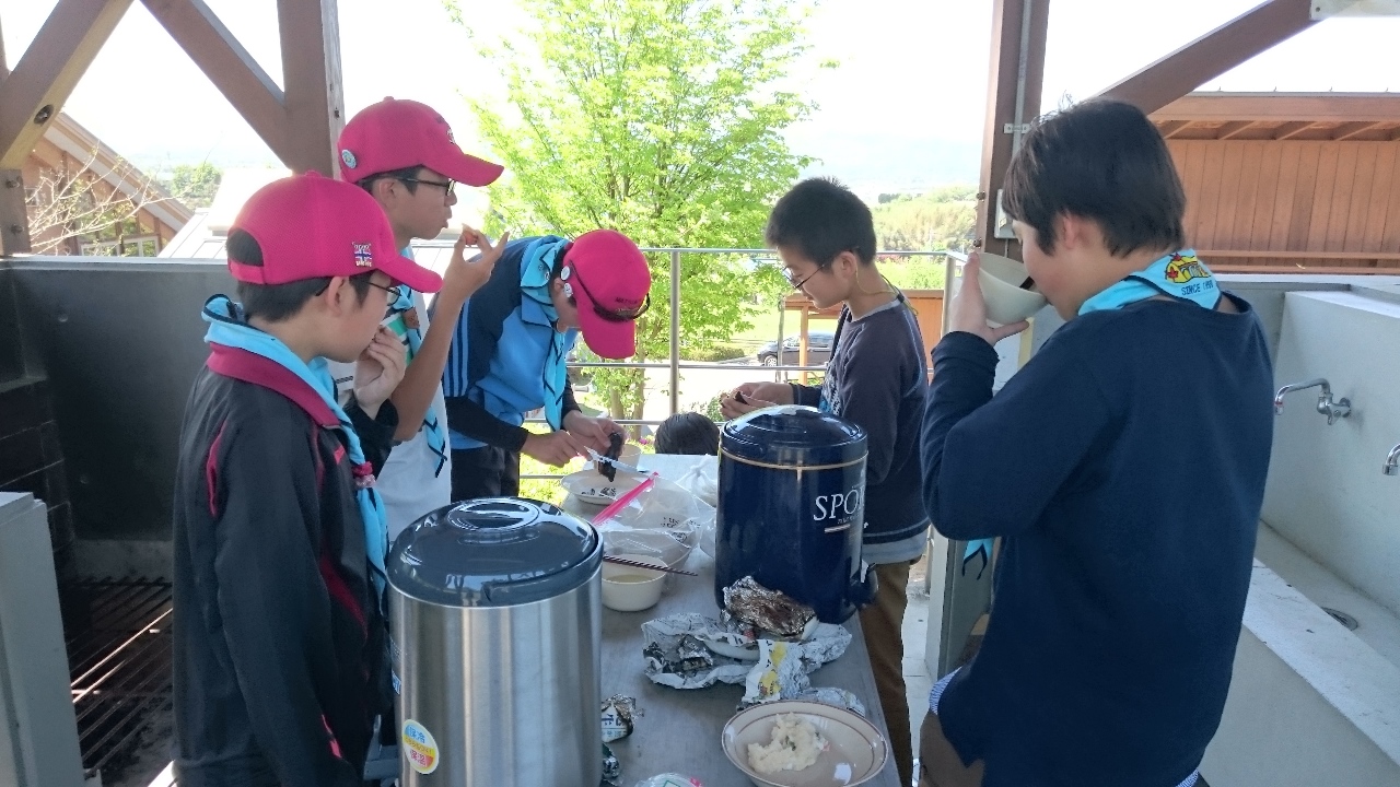 2016.05.04 わくわく料理 隊行事 2016.05.122025.10.13 隊行事 ビーバー隊(小1・2)ボーイ隊(小6〜中学生) ビーバー隊とボーイ隊は、安中市学習の森で集会を行いました。 今日作る料理は「カートンドッグ」です。 背を切ったコッペパンにソーセージをはさみ、アルミホイルで包んで牛乳パックに入れたら準備完了。 牛乳パックに火をつけて、燃え尽きたら焼き上がりです。 マッチで火がつけられるかな? 火の管理はボーイ隊のお兄さんたちにお願いしました。 メントスとサイダーで楽しいデザートも作りました。 おいしくいただきます! (文・ビーバー隊長)