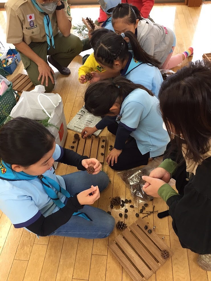 クリスマスリース風に、拾ってきた松ぼっくりなど木の実を貼り付けます。